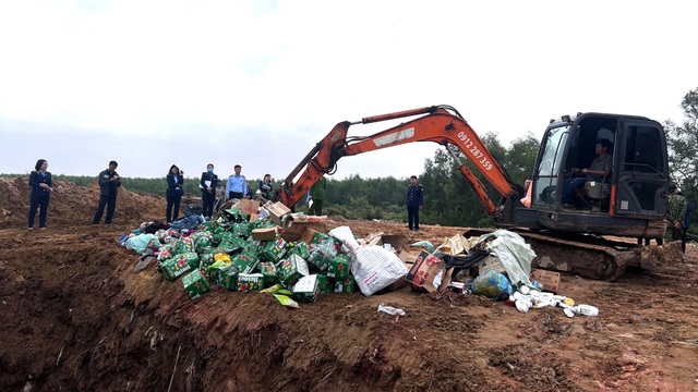 Cơ quan chức năng tiến hành tiêu hủy lượng lớn thực phẩm, mỹ phẩm, thực phẩm chức năng bị tịch thu vì nhập lậu, không đảm bảo chất lượng, quá hạn sử dụng, không giấy tờ.